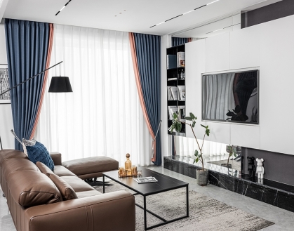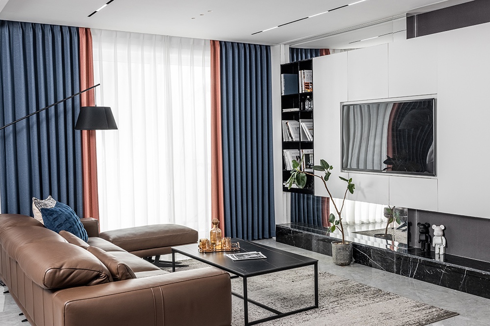 設(shè)計(jì)理念:以藏藍(lán)作為主題色彩來打造輕奢風(fēng)范的客廳空間,配搭純潔的白色,將渾然天成的貴族氣質(zhì)極致凸顯,再配搭深棕真皮沙發(fā)、魅影黑電視柜和茶幾等極簡元素,打造奢美吸睛效果。