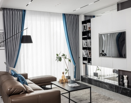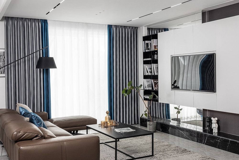 設(shè)計理念:以富于質(zhì)感的灰色系作為基調(diào)來裝飾這間客廳,營造著低調(diào)雅致的視覺觀感,作為點睛之筆的藍(lán)灰色軟裝側(cè)邊和大氣摩卡色真皮沙發(fā)上的抱枕呼應(yīng),令原本嚴(yán)謹(jǐn)?shù)目蛷d更多了一份靈氣與舒心。